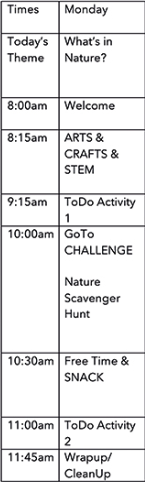 Some of the activities in this program were inspired by Haeley Giambalvo from Design Improvised. She has created this great at home camp with unique themes for each week. To get a better idea of how these themes can be used to create fun activities, check out this article from Fun365!